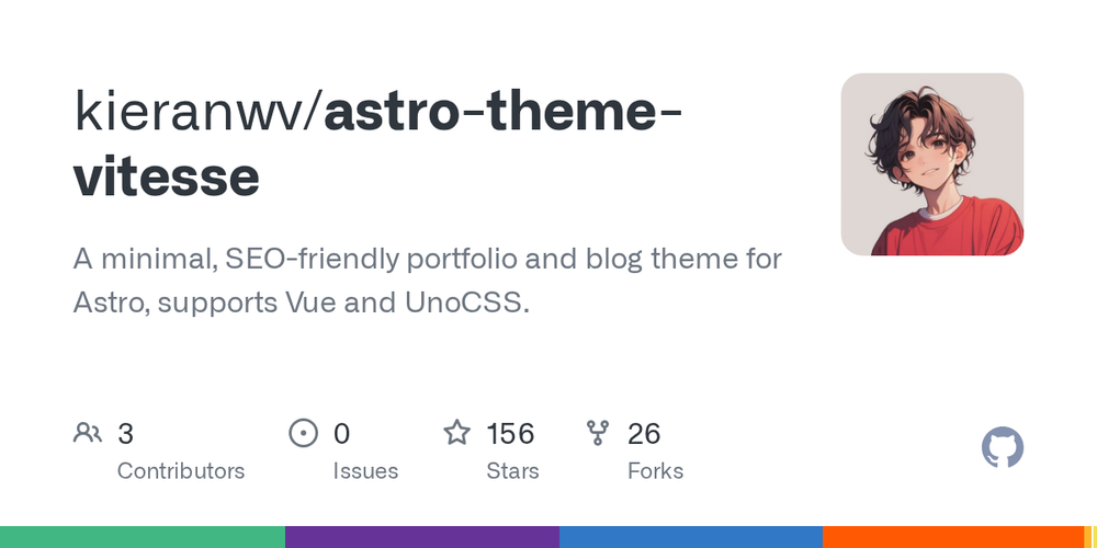 Astro Theme Vitesse is a minimal, SEO-friendly portfolio and blog theme built for Astro, offering robust support for Vue components and UnoCSS for styling. This theme prioritizes performance, achieving a perfect 100/100 Lighthouse score, ensuring fast loading times and an excellent user experience. It is fully responsive, adapting seamlessly to various screen sizes, and includes both light and dark theme options to cater to user preferences.Key features include comprehensive Markdown and MDX support, allowing for rich content creation with embedded components. Developers can leverage Vue Single File Components (SFC) directly within their Astro projects. The theme also provides auto-generated sitemaps and RSS feeds, enhancing SEO and content discoverability. Integrations with popular utility libraries like VueUse and Lodash are included, streamlining development. Styling is handled efficiently with UnoCSS, a highly performant atomic CSS engine.Getting started is straightforward: install dependencies with npm install, run locally with npm run dev (requires Node.js 18+), build for production with npm run build, and preview the build with npm run preview. The project is licensed under the MIT License, promoting open-source collaboration and flexibility. This theme is ideal for developers looking to quickly deploy a high-performance, customizable portfolio or blog site with modern web technologies.