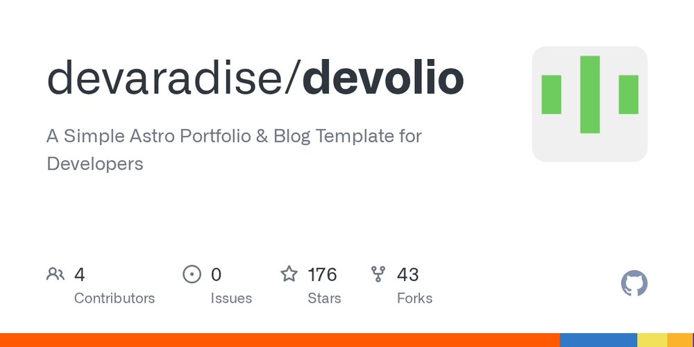Devolio is a free, high-performance portfolio and blog template built with Astro, designed to help developers quickly set up their personal websites. It emphasizes minimal styling, allowing for easy customization, and boasts a perfect 100/100 Lighthouse performance score.